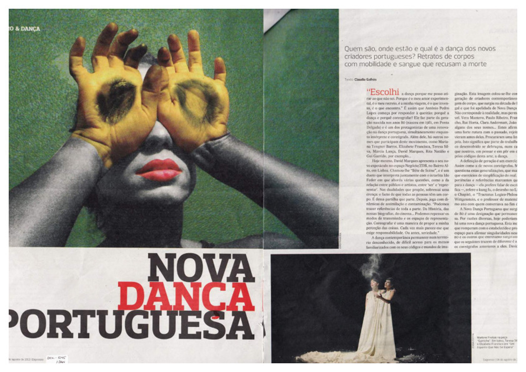 "Durante todo o século XX, e até hoje, é usado o termo ‘Dança Contemporânea’, mas não é certo que seja possível englobar nesta etiqueta a diversidade de práticas, estilos e experimentações que constituem a história da dança, até porque as datas abrangidas por este período histórico permanecem imprecisas e polémicas, através das distinções entre ‘dança moderna’, ‘dança pós-moderna’ e ’dança actual’. A dança seria a arte do sensível por excelência. O seu ‘locus’ e suporte próprio seria o corpo (humano). O corpo da dança seria assim um lugar de produção de autenticidade (supostamente) pré-linguística. Identificada como movimento contínuo, a dança apresentar-se-ia sempre como corpo (visivelmente) em movimento, expressando verdades extraídas directamente do seu ser mais profundo. A dança seria aquela arte que se distingue de todas as outras por desaparecer sem deixar rastro de cada vez que aparece – perfeita incorporação do efémero: uma (des)aparição. A performance da dança escaparia assim completa e irremediavelmente a toda e qualquer tentativa de documentação por meio de captação videográfica, notação, descrição, abordagem crítica e/ou teórica. A dança escaparia assim às malhas do arquivo, bem como às economias da indústria cultural, para não falar nos mercados da espectacularização e da financialização da vida em geral. Assim sendo (se fosse), seria caso para dizer que após uma longa história de esquecimento e/ou desprezo no âmbito do sistema das belas-artes e da estética, e após uma boa dose de idealização filosófica, a dança poderia ter-se tornado no paradigma de todas as artes e poderia fazer sentido chamar-lhe ‘objecto do século’." — PAULA CASPÃO